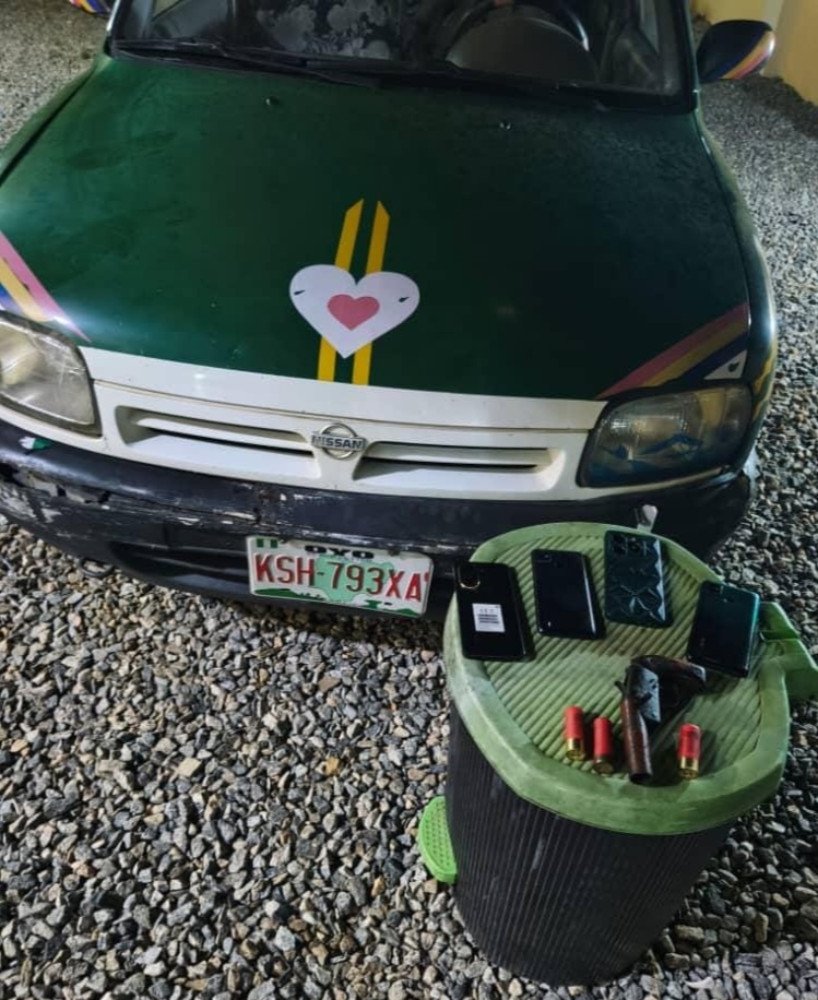 Exhibits recovered from the suspects during the operation include: One (1) Nissan Micra with Reg. No. KSH 793 XA, One (1) double-barrel short gun, One (1) single-barrel short gun, Two (2) locally made single-barrel pistols, Twenty-Nine (29) live cartridges, Nineteen (19) mobile phones, sum of ₦72,000 cash, One (1) wristwatch, Three (3) necklaces, and Three (3) ATM cards.
