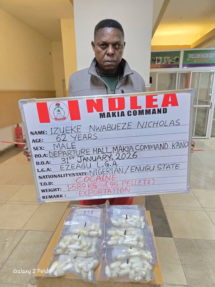 Nwabueze was arrested on Saturday 31st January 2026 at the Kano airport during the outward clearance of passengers going to China via Addis Ababa on Ethiopian Airlines flight ET940. When taken for body scan, he tested positive for ingesting illicit drug and was promptly placed under excretion observation.