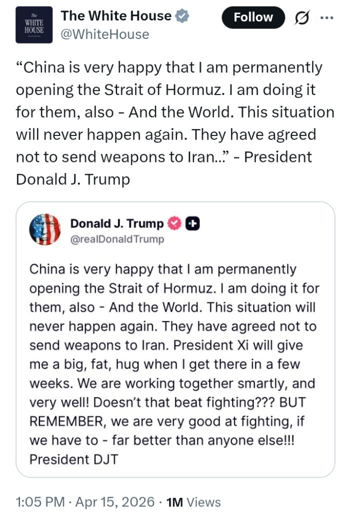 On Wednesday, however, Trump stated in a Truth Social post that “China is very happy that I am permanently opening the Strait of Hormuz.” He added that “I am doing it for them, also – and the World.”